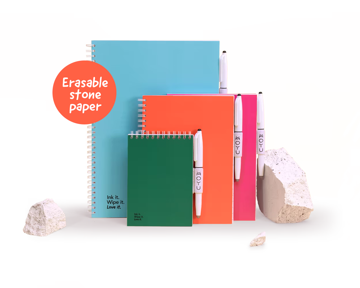 Surprise colleagues and clients with the perfect feel-good, do-good gift: an erasable notebook made from 100% recyclable stone paper with a unique impact story that will leave a lasting impression.